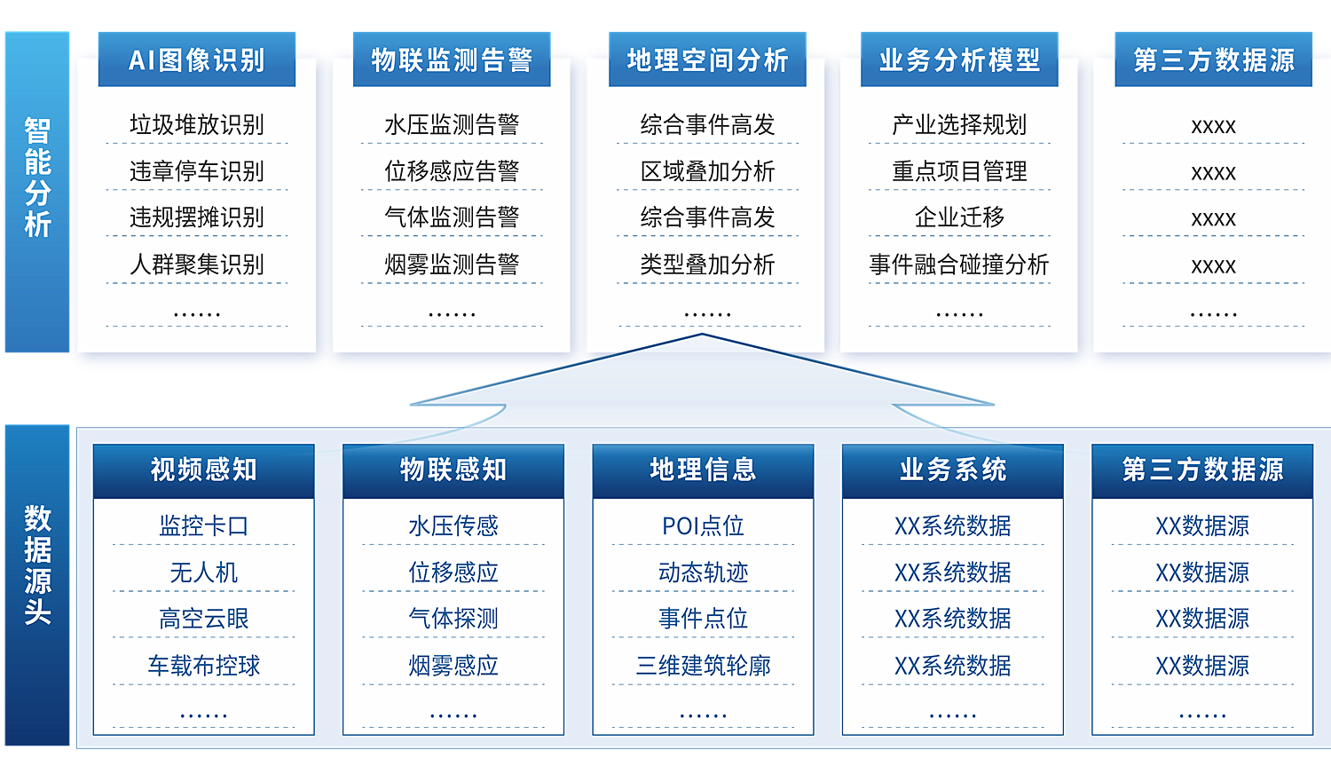 支持整合(he)AI識別、網格巡查、無人機巡查、網絡輿(yu)情等多平臺數據資源(yuan), 實現多源(yuan)事件的融合(he)共享;并可深度融合(he)前(qian)端AI識別、人工智(zhi)(zhi)能(neng)(neng)、物聯感知等技術應用,對城市全(quan)要素對象進行全(quan)時(shi)段(duan)智(zhi)(zhi)能(neng)(neng)監測和自動(dong)巡(xun)檢(jian),對各類(lei)異常事(shi)件進行自動(dong)感知、智(zhi)(zhi)能(neng)(neng)分析、及(ji)時(shi)預(yu)警、主動(dong)告警,實現全(quan)域態(tai)勢的智(zhi)(zhi)能(neng)(neng)感知。