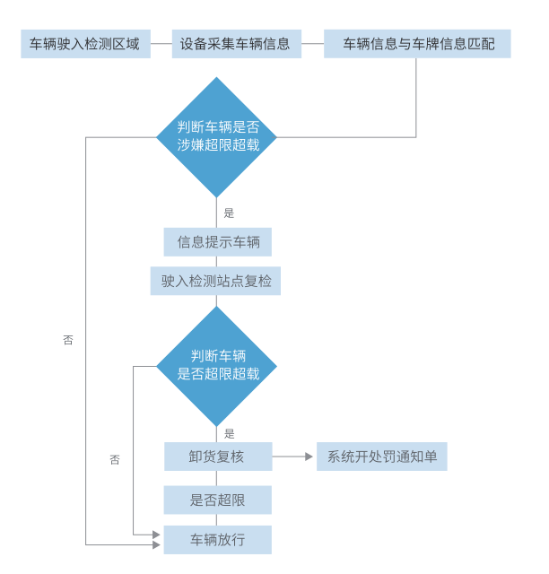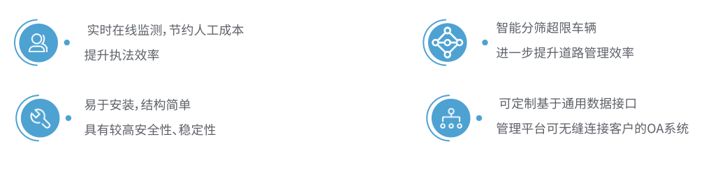 固(gu)定治超(chao)檢測(ce)站點之前(qian)所設置(zhi)預檢測(ce)區,對貨運車輛進(jin)行篩查,對可(ke)能超(chao)載車輛記(ji)錄并(bing)引(yin)導其前(qian)往復核點,進(jin)行復核。通過分段式(shi)的(de)初檢和復核,提高了(le)監測(ce)效(xiao)率也保證了(le)準確率。