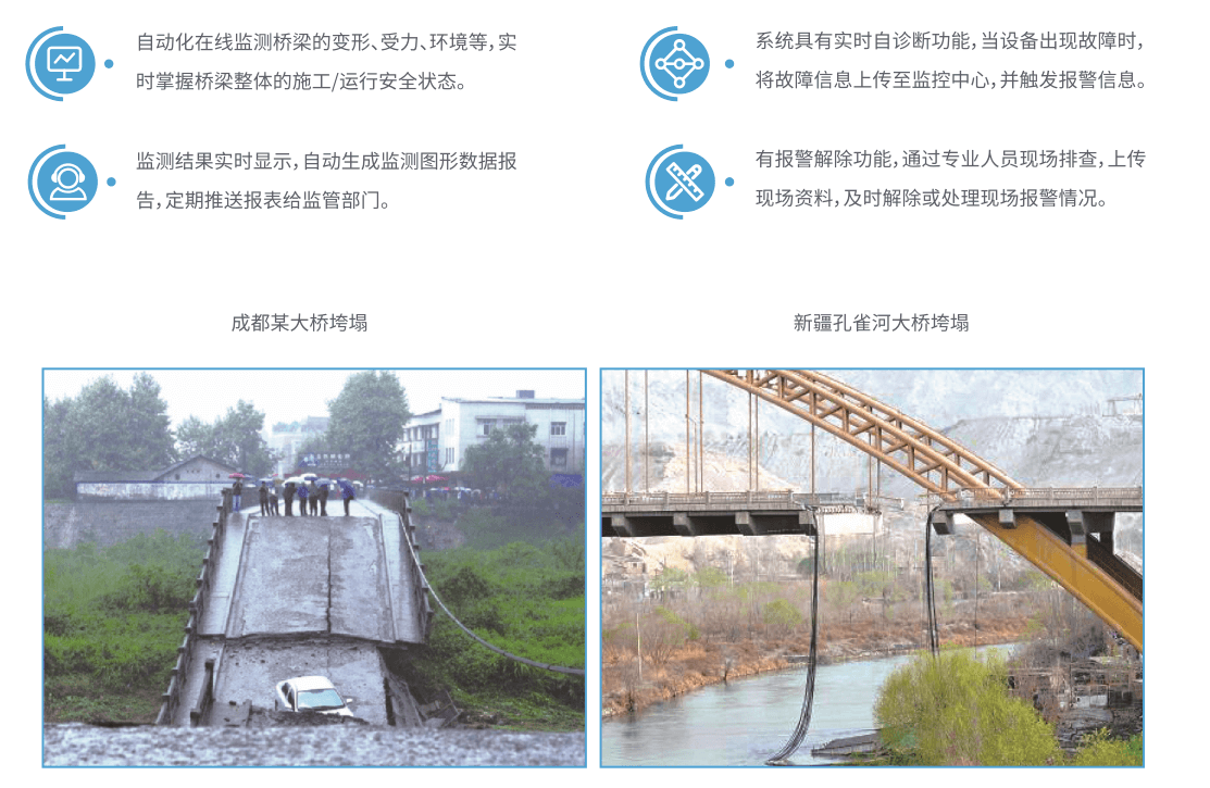 我國(guo)(guo)是個橋(qiao)(qiao)梁(liang)(liang)大國(guo)(guo),據交通部最新數據統計,我國(guo)(guo)有 75.71 萬座公路橋(qiao)(qiao)梁(liang)(liang) ( 不(bu)含市政橋(qiao)(qiao)梁(liang)(liang) )。影(ying)響橋(qiao)(qiao)梁(liang)(liang)的因(yin)(yin)素居多(duo),人(ren)為因(yin)(yin)素、車(che)輛長期超(chao)載、材料自身退化等(deng),缺乏及(ji)時到(dao)位(wei)的管理(li)養護導致結構(gou)各(ge)部分在遠(yuan)沒有達到(dao)設計年限前就產(chan)生(sheng)不(bu)同程(cheng)度的損傷和(he)劣(lie)化。損傷如果不(bu)能及(ji)時得(de)到(dao)檢測和(he)維修(xiu),輕則影(ying)響行車(che)安全和(he)縮短橋(qiao)(qiao)梁(liang)(liang)使用壽命,重則導致橋(qiao)(qiao)梁(liang)(liang)突(tu)然(ran)破壞和(he)倒塌。因(yin)(yin)此,建立一套(tao)針對橋(qiao)(qiao)梁(liang)(liang)的智能在線監(jian)測系統顯得(de)尤為迫切。